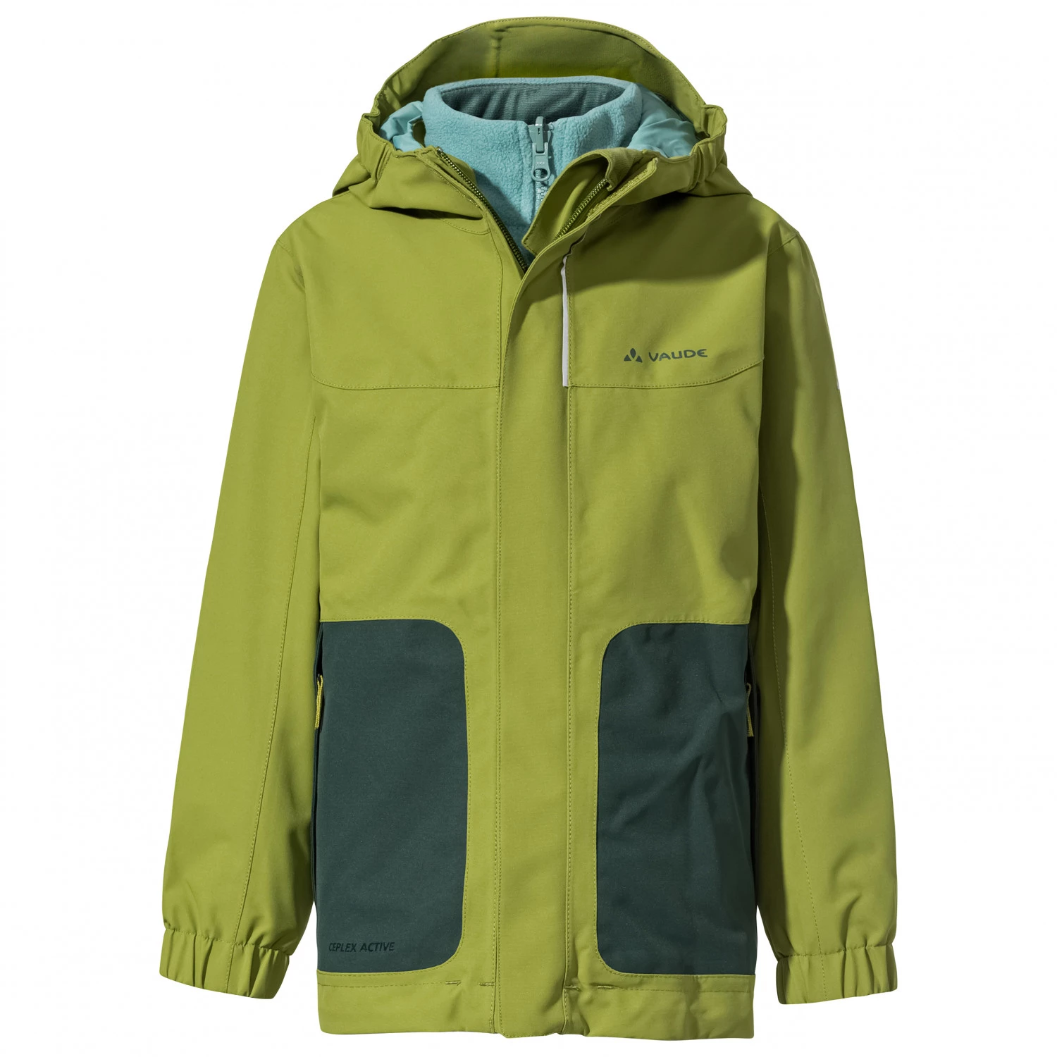 Cette double veste Vaude assure une protection infaillible contre le froid et les intempéries grâce à sa composition en tissu doublé Ceplex Active imperméable et respirant et à sa veste intérieure zippée en matière polaire. Cette veste polaire douce et facile d’entretien peut par ailleurs très bien se porter seule – notamment autour d’un feu de camp, dans la tente ou encore au refuge. À l’épreuve des humeurs de la météo, la veste extérieure de la Kid’s Campfire 3IN1 Jacket IV proposée par Vaude est également munie d’une capuche ajustable qui est taillée d’une seule pièce, de deux grandes poches latérales zippées et d’une fermeture éclair avant intégrale sous une double patte de protection. Les bas de manches et le rebord de la capuche sont dotés d’empiècements élastiques afin d’offrir un ajustement optimal à la morphologie de chacun, et d’empêcher le vent ou l’humidité de pénétrer dans la veste.